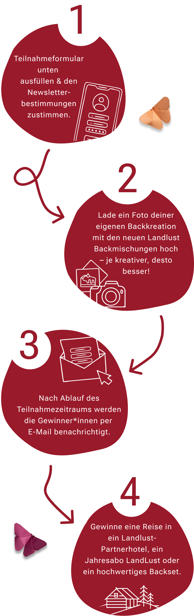 - Lade ein Foto deiner eigenen Backkreation mit den neuen Landlust Backmischungen hoch – je kreativer, desto besser!